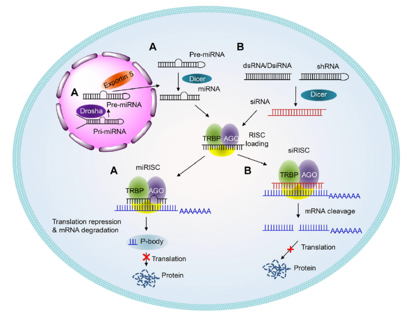 siRNA通常為含有20~25個堿基對的雙鏈RNA組成,分子量約14~18KD。siRNA和miRNA(內(nèi)源性)均通過RNA干擾(RNAi)機制,介導(dǎo)靶mRNA降解(siRNA)或抑制mRNA翻譯(miRNA)等,以序列特異性的方式敲除靶基因的表達。