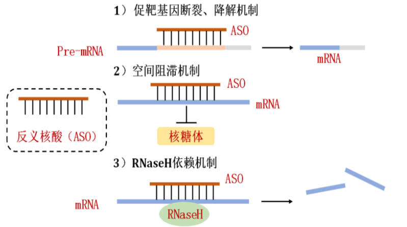 ASO藥物通常是由13至25個核苷酸組成的單鏈DNA或RNA分子,約6~9KD,作用機制有3種: